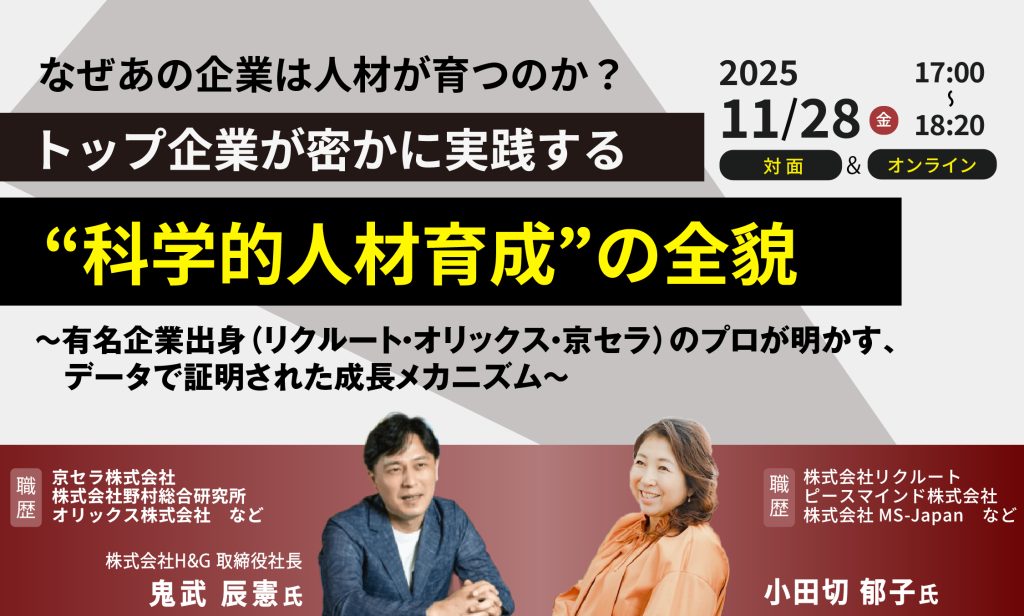 「なぜ研修では人が育たないのか?」この本質的な問いに、リクルート・京セラ・オリックス出身の経営と現場の第一線で活躍する専門家が対談形式で答えます。育成を”見える化”するアセスメント手法と、実際の導入企業の成功事例を通じて、再現性のある人材育成の設計法をご紹介します。